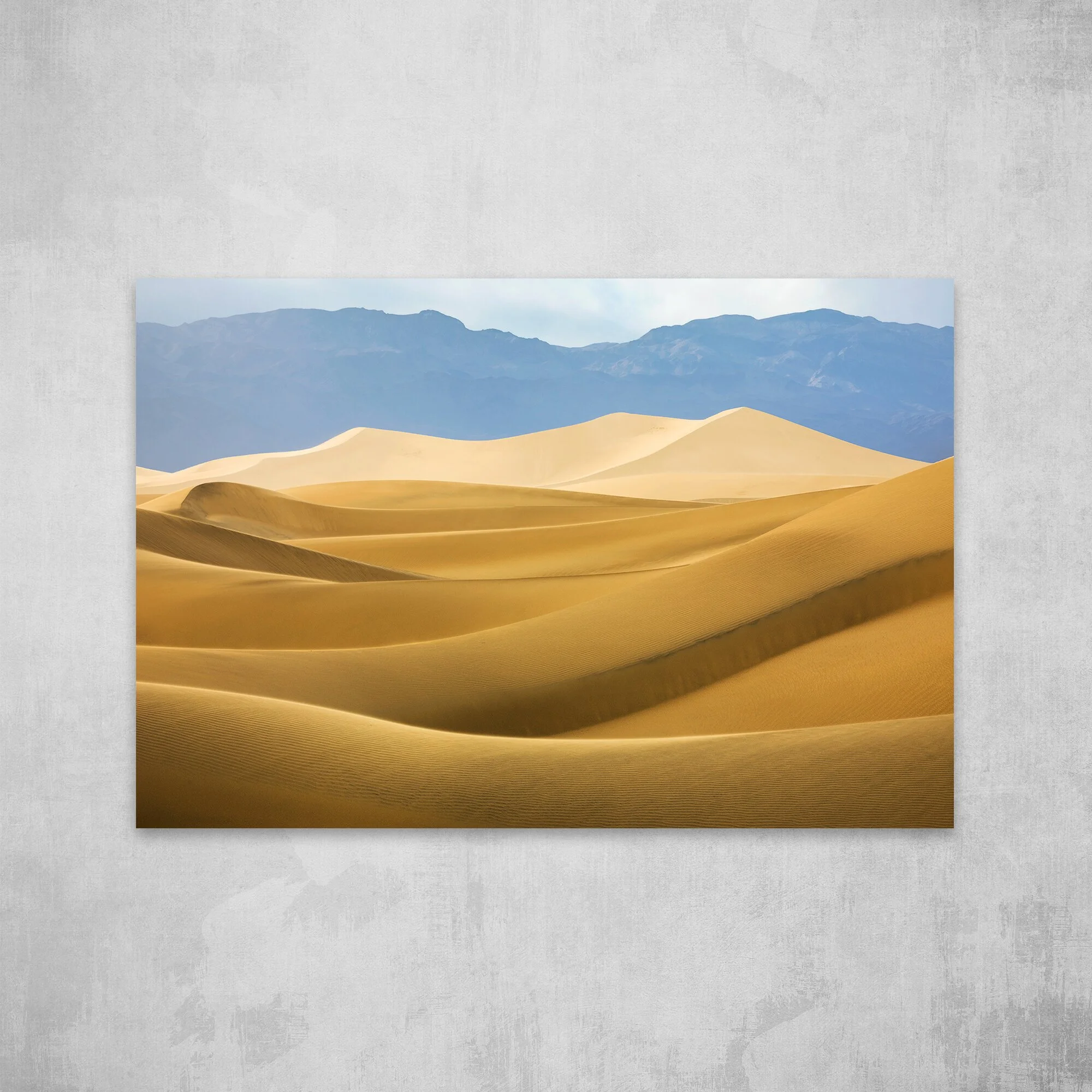 Layers of sand and mountains in the soft light at Mesquite Sand Dunes, in California’s Death Vally National Park.
